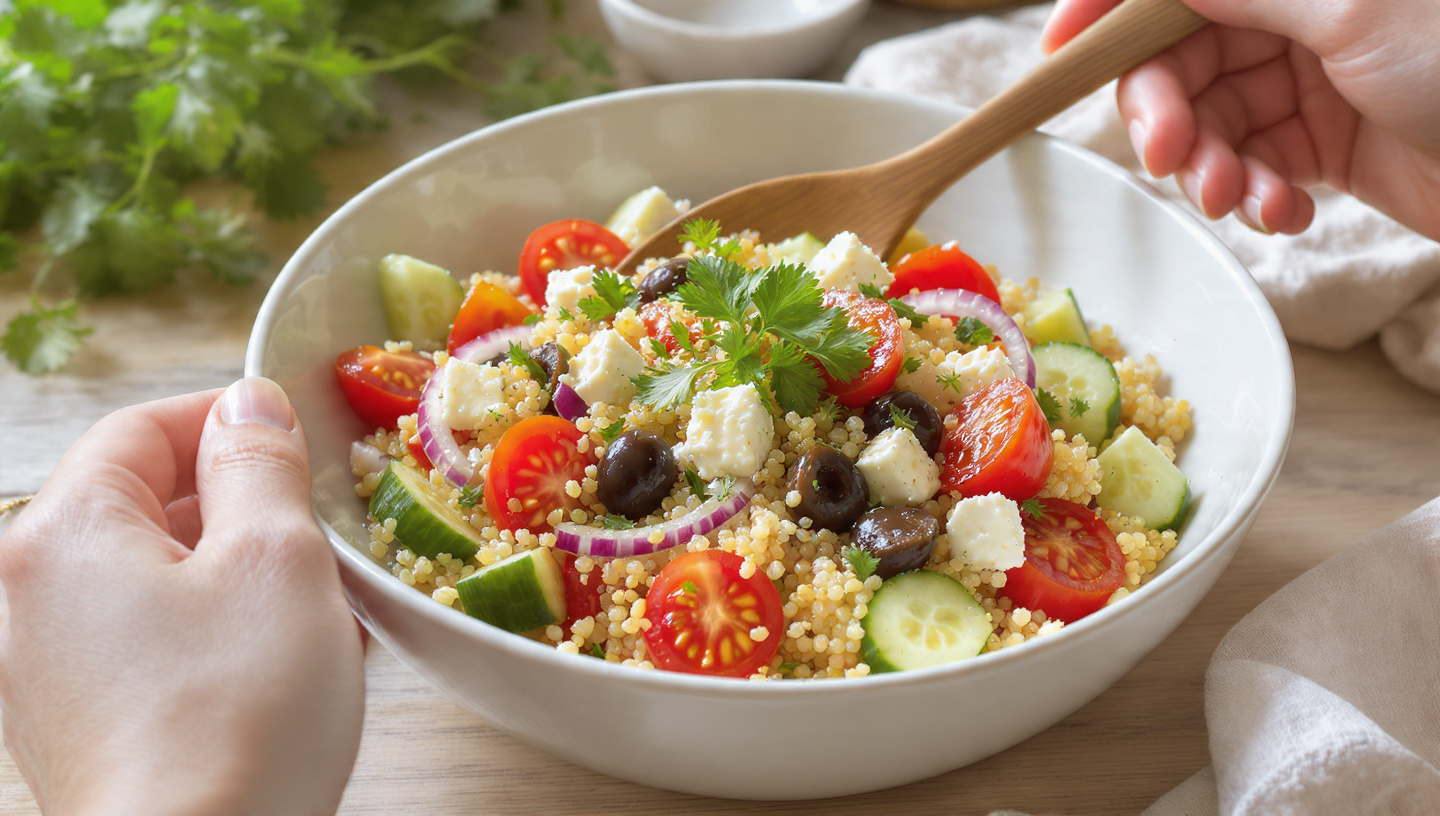 Mediterranean quinoa salad with fresh vegetables and herbs, quick and easy vegetarian dish.
